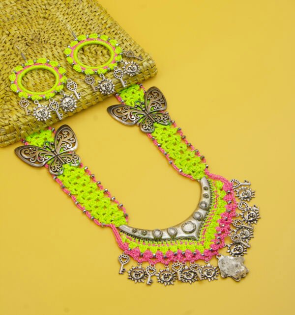 This eye-catching necklace and earring set combines neon green and pink crochet work with oxidized silver butterfly motifs and dangling lion-face and key charms. The broad, handwoven band is both bold and playful, making it a standout piece for festive gatherings or themed events. Paired with matching earrings that echo the charm motifs, this set radiates a fun, contemporary tribal flair. Ideal for Navratri nights, Garba dances, or any occasion where color and craft matter. A unique creation for those who love dramatic and youthful ethnic fashion.