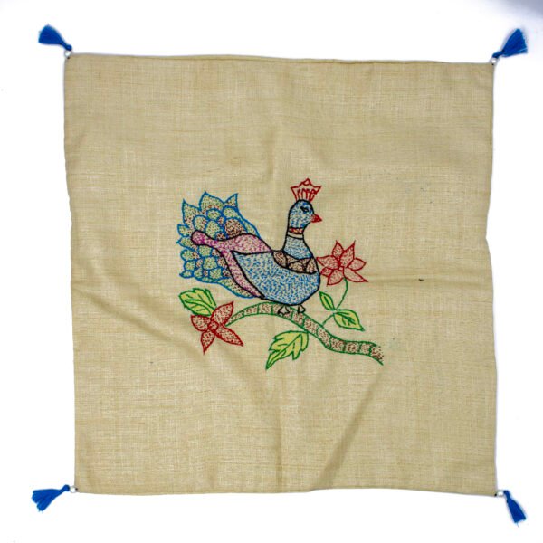 A majestic peacock sits amid blooming flowers, hand-embroidered on a beige cotton base. Blue corner tassels enhance its elegance, making this cover a graceful addition to your décor.