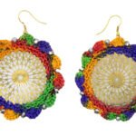 Bright and joyful, this pair combines a golden mandala base with crochet in vibrant colors like red, blue, orange, and green forming delicate scalloped petals. Inspired by temple garlands, it’s perfect for festive wear, cultural events, or gifting during festivals. The vivid palette reflects celebration and tradition.
