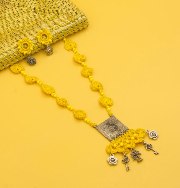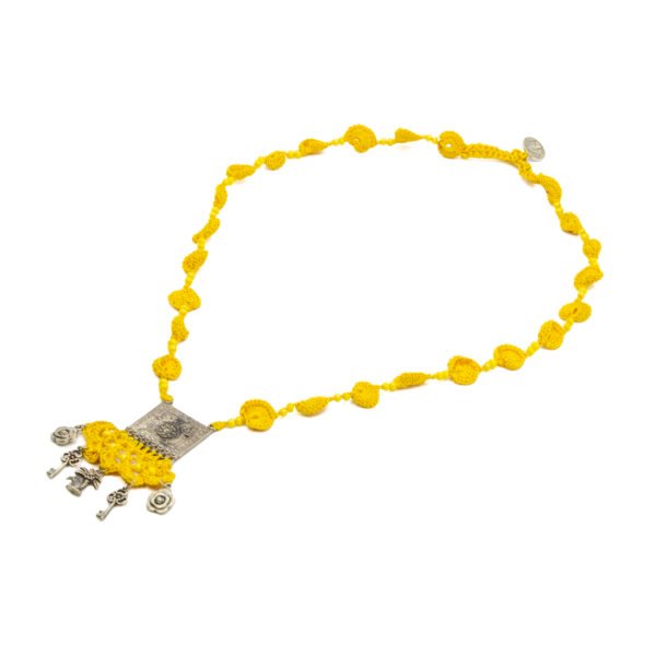 Yellow Crochet Necklace Set with Tribal Square Pendant Handmade